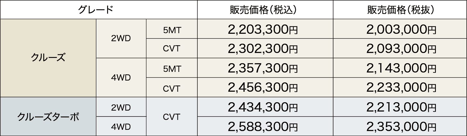 ■価格は当社販売価格〈(消費税10%込み)'25年3月現在のもの〉です。■価格はスペアタイヤ(応急用)、タイヤ交換用工具付の価格です。■価格にはオプション価格は含まれていません。■新規登録は4ナンバー登録です。■保険料、税金(除く消費税)、登録料などの諸費用、リサイクル料金は別途申し受けます。